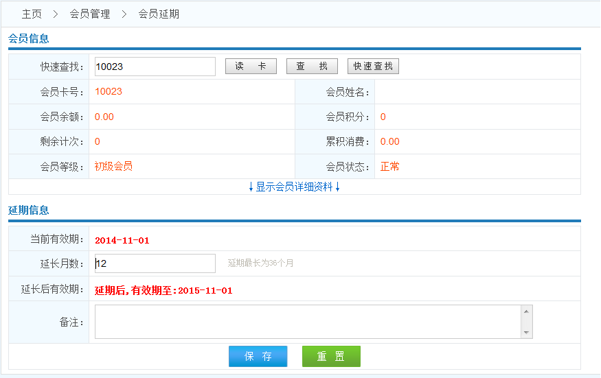 操作流程: 查找會員------>錄入延期的月份------>保存------>延期成功