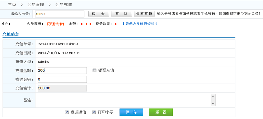 會(huì)員充值先刷會(huì)員卡或者手動(dòng)輸入卡號(hào) 填寫充值金額→ 點(diǎn)擊馬上保存按鈕