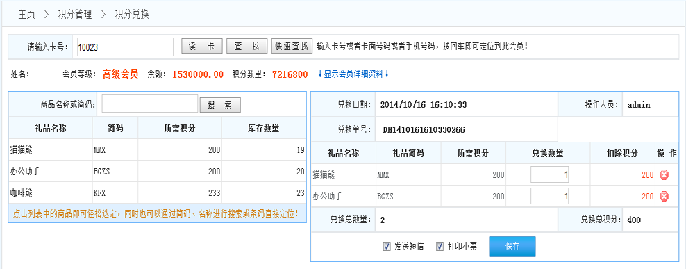 1.發(fā)送短信:如果系統(tǒng)開啟了短信功能,在完成兌換后系統(tǒng)會自動(dòng)給該會員發(fā)送通知短信,告知會員兌換信息!(開啟短信功能在 增值服務(wù)》服務(wù)參數(shù)》短信參數(shù)設(shè)置(對短信進(jìn)行參數(shù)設(shè)置))