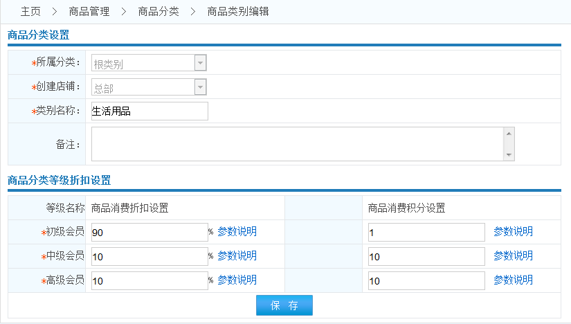 說明:商品分類等級折扣設置 這一欄會展示出系統(tǒng)中的所有的會員等級