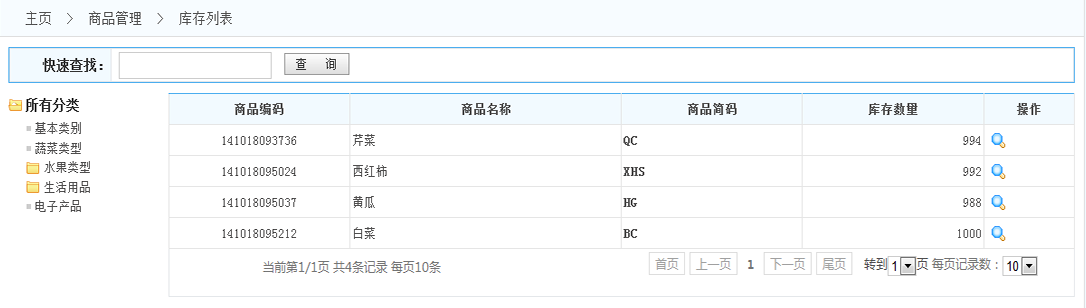 庫存列表: 1.快速查找:根據(jù)商品的編碼或者簡碼或者名稱,快速的查找出指定的商品 2.類型列表:列出所有的商品分類 點擊分類名稱 商品列表中會顯示這個分類的所有商品 3.商品列表:列出所有的普通商品 在列表的操作一欄可以查看異店庫存 如下圖