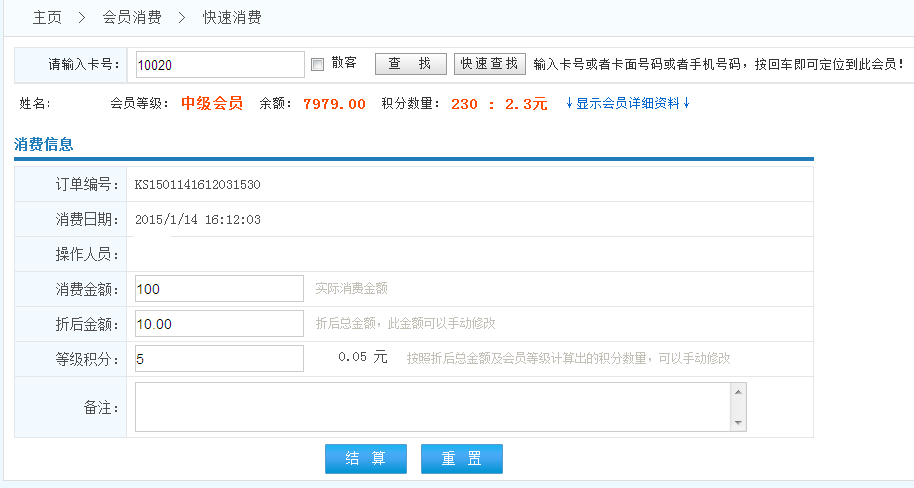 可輸入卡號或者卡面號碼或者手機號碼,按回車或查找按鈕定位到此會員!